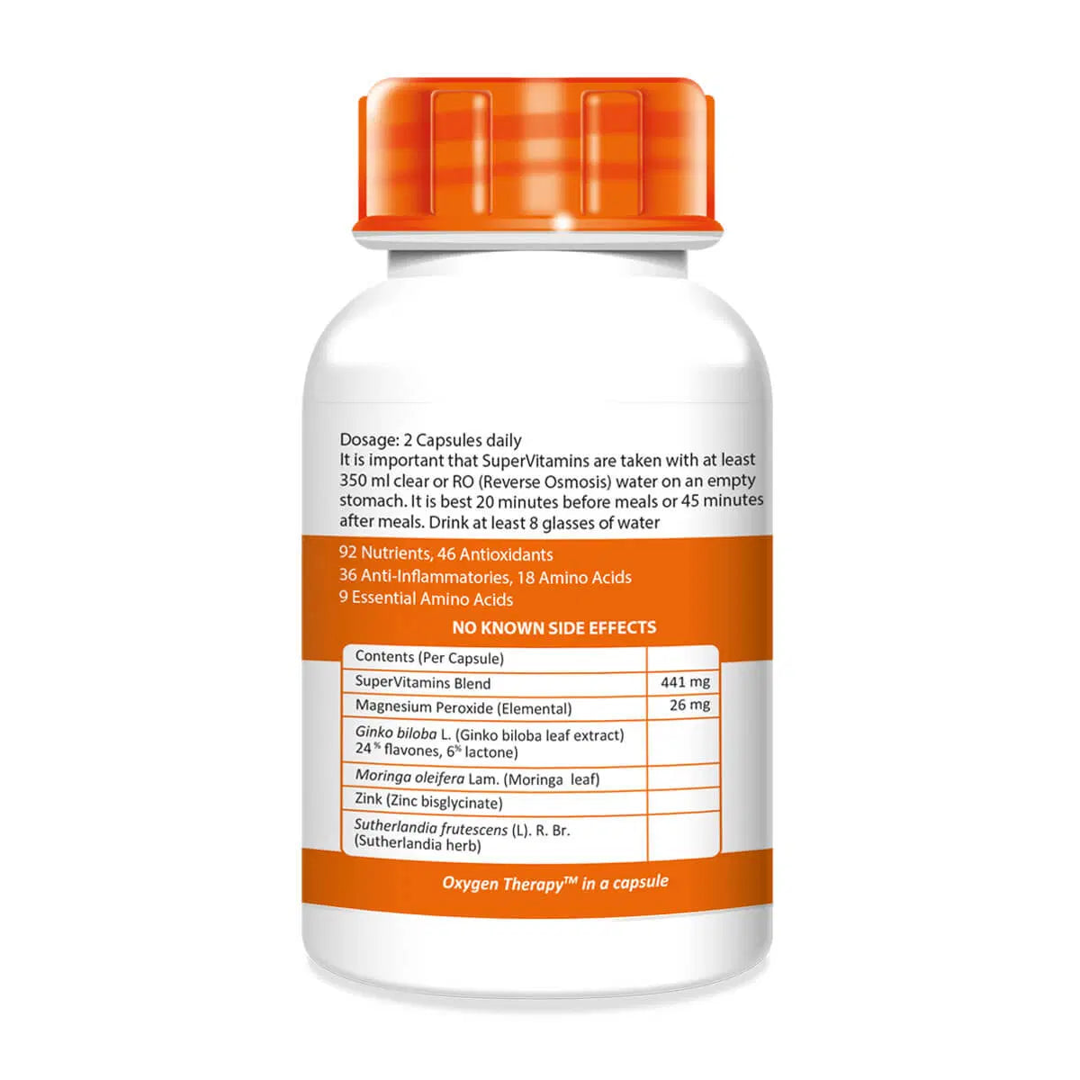 Super Vitamins +Oxygen provides you with the benefits that Mega Oxygen ™ provides along with a robust multivitamin that removes all of the stress and uncertainty out of managing the vitamins in your diet.